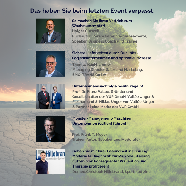 Unsere praxiserfahrenen TOP-Referenten präsentieren Ihnen zahlreiche Impulse zu aktuellen Managementthemen wie Datenschutz, DSGVO, Vertrieb, Logistik, Nachfolgeregelung, Strategie und Gesundheit.